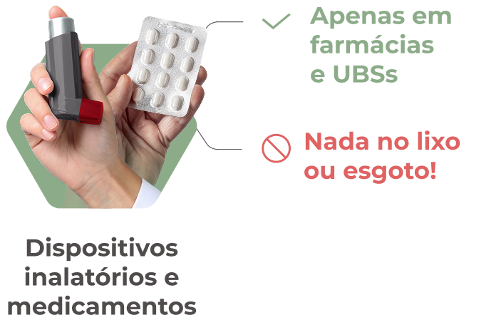 Todos os medicamentos de uso humano domiciliar podem ser descartados em UBSs e farmácias, sendo vencidos ou em desuso (comprimidos, líquidos, pomadas, dispositivos inalatórios etc.). Materiais perfurocortantes são aceitos apenas nas UBSs. É fundamental confirmar a disponibilidade do serviço no local escolhido para descarte.
